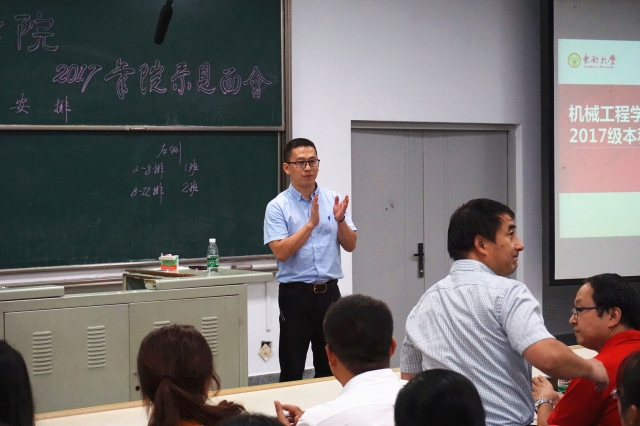 9月4日晚18:30,机械工程学院在教学楼J1-211举办了2017级本科新生见面会。学院党委书记张志胜、副院长陈云飞、孙蓓蓓、殷国栋,各系系主任,学办各位老师和各班班主任出席了见面会。本次会议由机械工程学院党委副书记、副院长王斌主持。