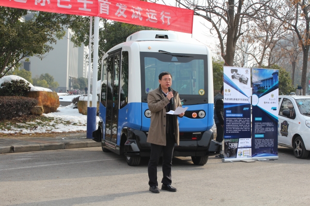 2018年2月2日上午,东南大学联合南京扬子国资投资集团有限责任公司在东南大学九龙湖校区举行合作运营的国内首辆智能网联无人迷你巴士的首发试运行,东南大学副校长吴刚教授,扬子国投集团董事长蔡龙,机械工程学院党委书记张志胜,学校相关部门负责人,以及巴士运营团队全体成员参加了首发试运行活动。发布会由机械工程学院副院长殷国栋教授主持。