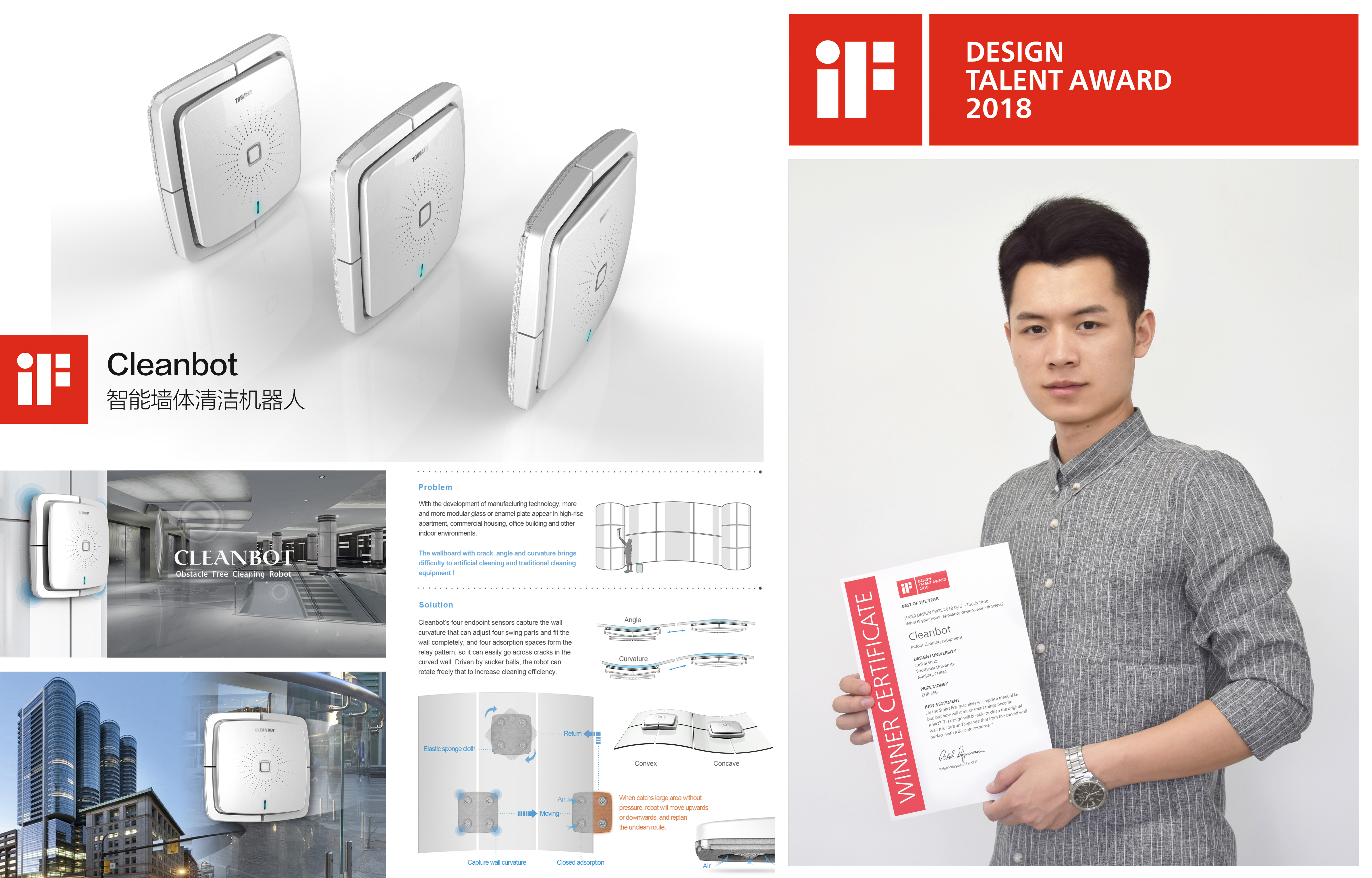 本次比赛是东南大学工业设计专业学生继2017年度获得广汽设计金奖后获得的又一国际顶级大奖,获奖作品“Cleanbot”得到了iF国际评审委员会的高度认可,该作品将在德国iF汉堡设计展中全年展出,并无限期的在iF官网的设计年鉴中展示。