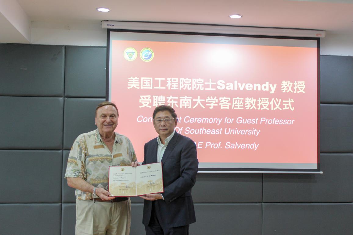 仪式由机械工程学院工业设计系主任薛澄岐教授主持。黄大卫副校长代表学校对于Salvendy教授的来访表示热烈欢迎,介绍了Salvendy教授的学术成就,诚挚希望Salvendy教授受聘我校客座教授,能够促进我校工业设计和工业工程学科不断进步发展,在上述领域高端人才引进和科学研究等方面给予指导和支持。随后,黄大卫副校长为Salvendy颁发客座教授聘书并佩戴校徽。