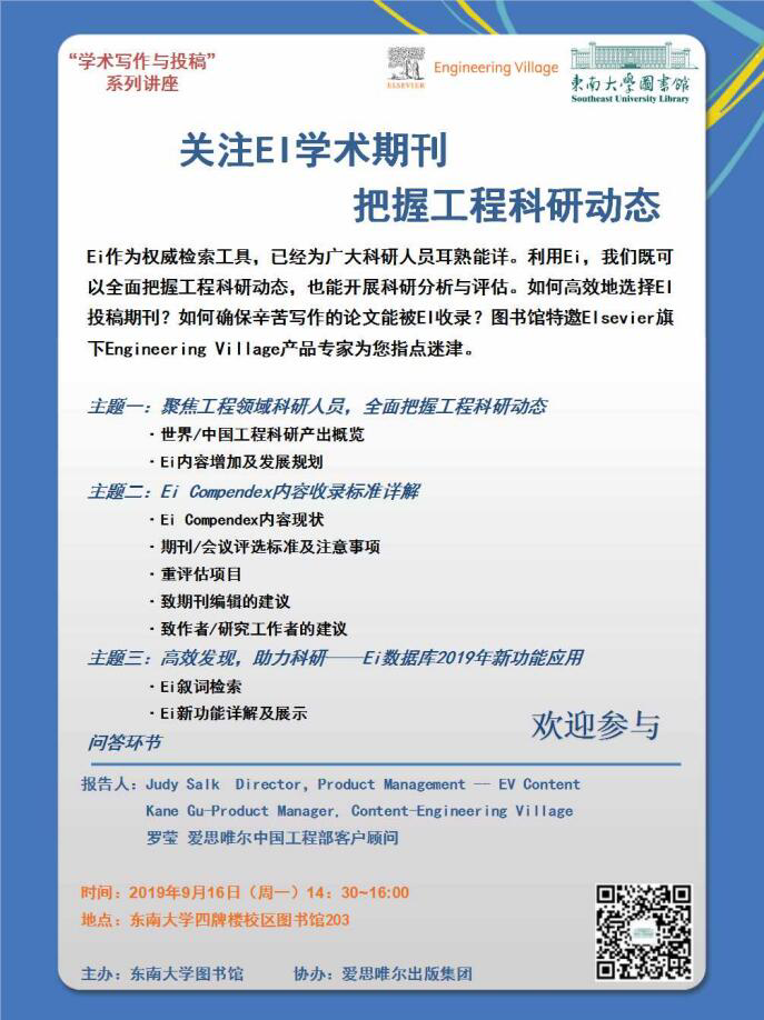 下周一下午2:30在四牌楼图书馆203有关于EI新功能及其选刊的讲座,欢迎经常使用EI平台、或对该讲座内容感兴趣的师生参加!!