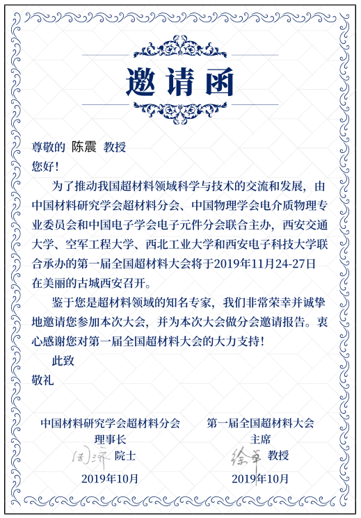 第一届全国超材料大会于2019年11月24 ~ 27日在美丽古都西安召开,九州线上平台的陈震教授受邀参加大会并作特邀报告。