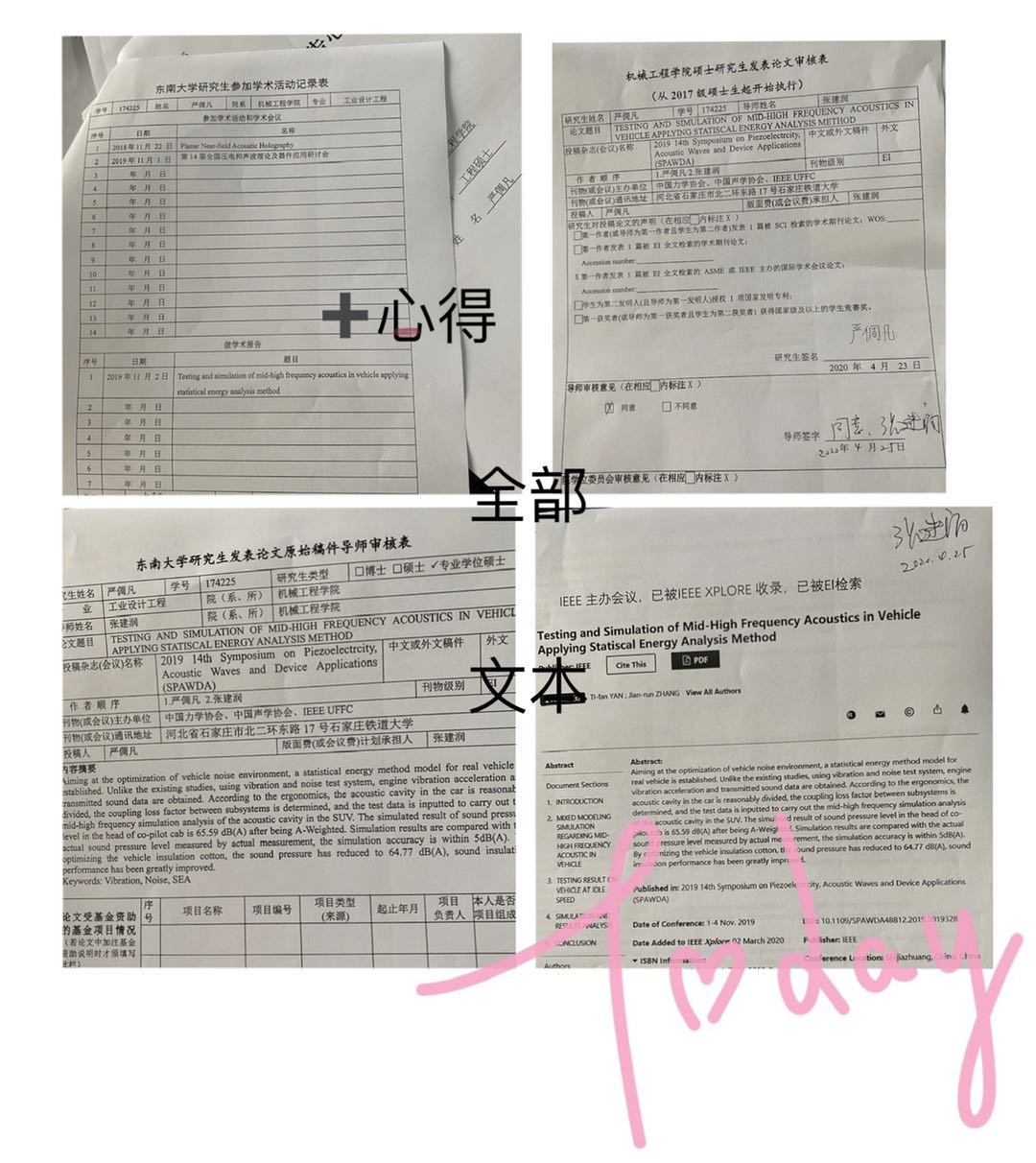 《东南大学研究生参加学术活动记录表》(网上下载)—-按规定要求填写会议和报告名称,导师签名;