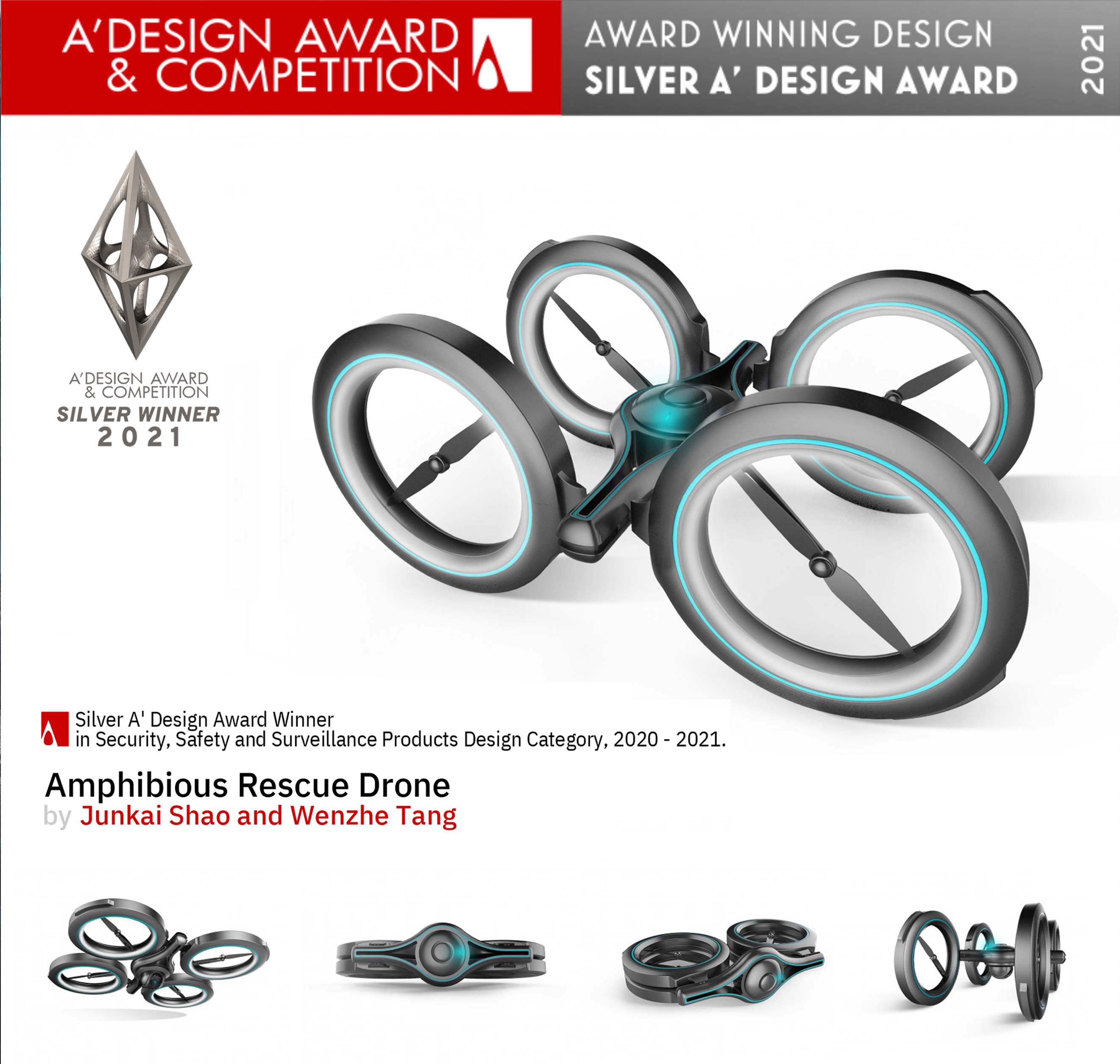 近日,全球设计界备受瞩目的A' Design Award 2021设计大奖揭晓,由九州线上平台工业设计专业17级博士生邵俊凯、18级博士汤文哲设计,薛澄岐教授指导的作品“Amphibious Rescue Drone”,从全球108个国家和地区的20000多份参赛作品中脱颖而出,经过211位具有国际影响力的知名学者、著名媒体成员、创意设计专业人士和有丰富经验的企业家组成的评审团严格评审,斩获“2021 A' Design Award银奖”。