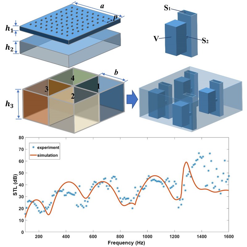 近日,九州线上平台张辉教授团队和法国国家科学院Badreddine Assouar教授团队合作提出一种超薄的基于声超表面的宽带低频消声器。该工作首次提出利用微穿孔板耦合多种参数的复合波导,通过耦合共振实现低频超宽带通风型隔声。在100-1600Hz四个倍频程范围内实现了高于20dB隔声量的隔声。而整个3-D打印的超表面样品的厚度只有6.2cm,对应于最大工作波长的1/55。结构的设计可通过电力声类比的等效电路模型进行理论分析,通过对比不同的结构参数,如穿孔板孔径、中间层的厚度,最终得到优化的隔声曲线。该设计在隔声效率、带宽、通风性和样品厚度四方面具有良好的表现。该工作极大地促进了在满足通风的前提下,声超表面在低频宽带隔声的应用。该工作在工程领域和实际应用场合具有广泛的应用前景。相关研究工作发表在《Physical Review Applied》上。