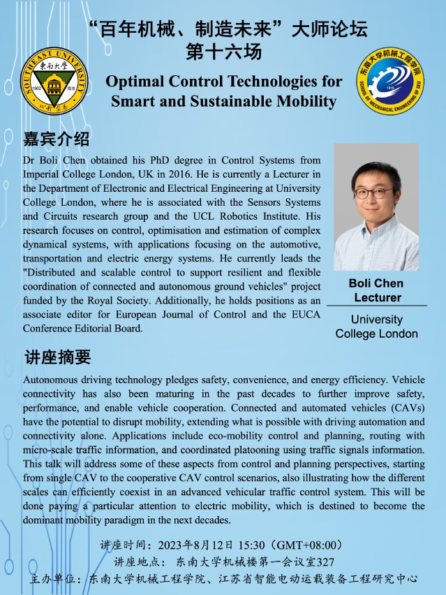 Dr Boli Chen obtained his PhD degree in Control Systems from Imperial College London, UK in 2016. He is currently a Lecturer in the Department of Electronic and Electrical Engineering at University College London, where he is associated with the Sensors Systems and Circuits research group and the UCL Robotics Institute. His research focuses on control, optimisation and estimation of complex dynamical systems, with applications focusing on the automotive, transportation and electric energy systems. He currently leads the Distributed and scalable control to support resilient and flexible coordination of connected and autonomous ground vehicles project funded by the Royal Society. Additionally, he holds positions as an associate editor for European Journal of Control and the EUCA Conference Editorial Board.