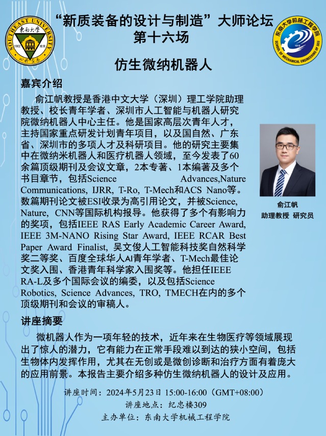 俞江帆教授是香港中文大学(深圳)理工学院助理教授、校长青年学者、深圳市人工智能与机器人研究院微纳机器人中心主任。他是国家高层次青年人才,主持国家重点研发计划青年项目,以及国自然、广东省、深圳市的多项人才及科研项目。他的研究主要集中在微纳米机器人和医疗机器人领域,至今发表了60余篇顶级期刊及会议文章,2本专著、1本编著及多个书目章节,包括Science Advances,Nature Communications, IJRR, T-Ro, T-Mech和ACS Nano等。数篇期刊论文被ESI收录为高引用论文,并被Science, Nature, CNN等国际机构报导。他获得了多个有影响力的奖项,包括IEEE RAS Early Academic Career Award, IEEE 3M-NANO Rising Star Award, IEEE RCAR Best Paper Award Finalist, 吴文俊人工智能科技奖自然科学奖二等奖、百度全球华人AI青年学者、T-Mech最佳论文奖入围、香港青年科学家入围奖等。他担任IEEE RA-L及多个国际会议的编委,以及包括Science Robotics, Science Advances, TRO, TMECH在内的多个顶级期刊和会议的审稿人。