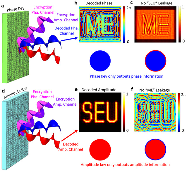 针对这一挑战,张辉/朱一凡教授团队基于可独立调制反射声波幅值与相位的超表面对双信道全息图像进行加密与解密。由于直接传输的双通道全息图像信息具有耦合性,即幅值与相位信道图像互相耦合造成信息泄漏,直接威胁通讯安全。通过加密超表面对幅值和相位信道引入随机数矩阵,从而使得加密声场中的全息图变为乱码(图1)。在加密声场中的工作位置放入相应信道的密钥超表面即可还原重建原始全息图像信息。不同信道的密钥超表面只能解密得到各自信道的原始图像信息,不会出现信道耦合造成信息泄漏(图2),从而实现双通道超全息信息解密:相位通道读取字母“ME”(图2b), 幅值通道读取字母“SEU” (图2e)。