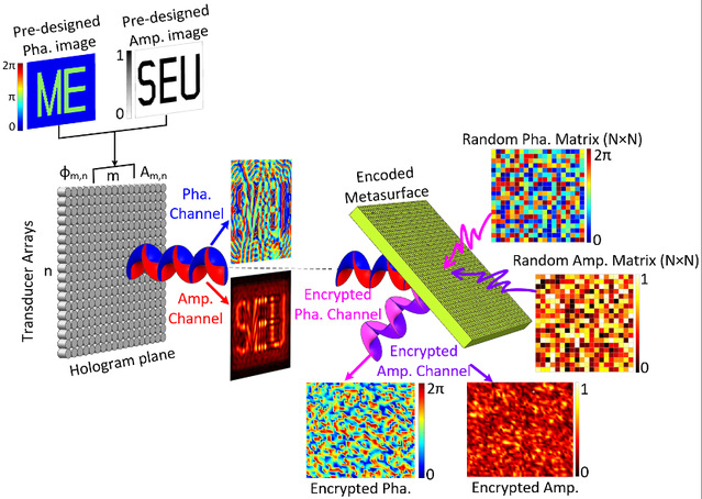 近年来,声学超全息技术受到了极大关注,因为它能够利用声学超材料/超表面对声波进行特殊操控,例如声波异常折射与反射、声聚焦、弯曲声束、声扩散等,从而将声场投射成任意形状和投射到任意位置。声学全息图像中最受关注的物理量是声波振幅(或强度),它表示声音能量的空间分布,可应用于微粒操控,声场重建或超声波治疗等。在传统的声全息技术中,全息图的相位分布是微不足道的,通常不会影响物理效果。然而,在信息通信方面,我们可以将全息图像作为需要传递的信息,因此其物理效应并不重要。在这种情况下,相位则是一种有价值的信息载体,其分布与振幅一样包含信息,振幅和相位可以是两个独立的信息通道。目前,综合、全面地使得声全息技术成为声通讯的一项成熟技术手段仍是一个具有挑战性的难题。另一方面,作为通信安全的重要保证,信息的加密与解密方式是至关重要的。目前对于声全息图像传输过程中的加密手段的研究也十分有限。