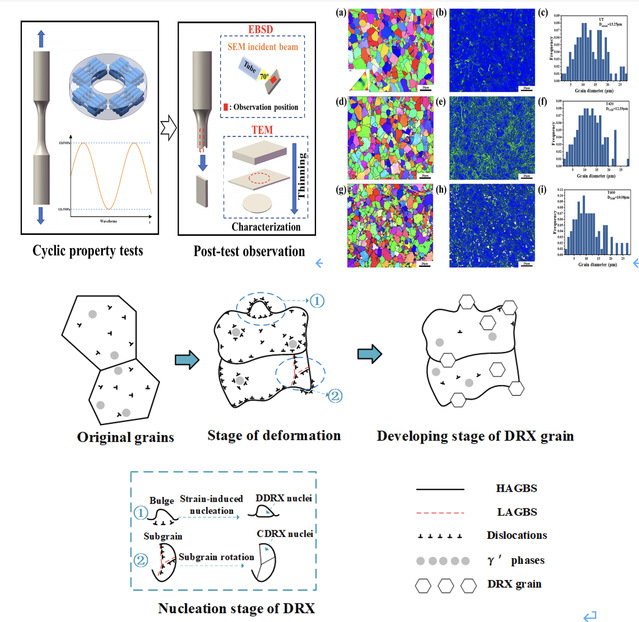 FGH95镍基高温合金是大推力航空发动机涡轮盘的理想材料,能够在高温条件下承受高转速下涡轮叶片和盘身产生的巨大离心力。然而,目前对FGH95在高温疲劳条件下的微观变形机理尚不清晰。本文研究了FGH95合金在高温疲劳服役条件下的微观变形机理,揭示了在不同温度下FGH95合金内部存在的多种动态再结晶(DRX)机制。其中,连续动态再结晶(CDRX)和不连续动态再结晶(DDRX)在不同温度下的变形过程中分别占据主导地位,该研究为涡轮盘在高温服役条件下的设计提供了微观机理支撑。