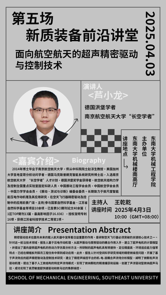 精密驱动技术在面向未来的载人航天器中发挥着日益重要的作用,是研制空天飞行器必须突破的关键核心技术之一针对这一前沿技术领域,报告人基于压电作动机理,从超声振动与摩擦驱动的耦合作用入手,建立了超声电机的计算模型,并提出了面向旋转超声电机的热动力学仿真分析方法。所研制的超声电机具有转速快、定位精度高、环境适应能力强等特点,已经在嫦娥系列探月工程任务中得到成功应用。此外,报告人针对空间科学研究领域的精密微操控问题,开展了基于声流效应的超声精密致动及控制技术研究,建立了精密声操控平台的机-电-液耦合声流场分析模型,阐明了微颗粒声流驱动机理,提出了基于人工微结构的特定声流场模式,实现了微纳颗粒的精准捕获和运输,创建了声流驱动型微纳超声马达,成功实现了高灵敏度超快速驱动和微马达的集群操控。