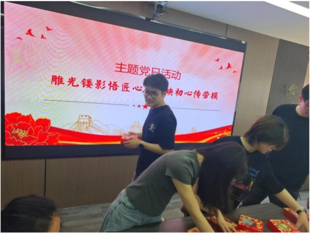 主题党日活动环节,老师们积极参与特色手工活动,以制作爱国主题红色文创纸雕灯为载体,将劳模精神与红色文化深度融合,让老师们在动手实践中感悟匠心精神、传承红色基因。