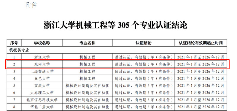 近日,中国工程教育专业认证协会发布了《关于公布浙江大学机械工程等305个专业认证结论的通知》(工认协〔2021〕13号),通知公示了2020年参加全国工程教育专业认证的认证结论。东南大学机械工程专业顺利通过认证,有效期6年(2021年-2026年),这是东南大学机械工程专业第四次通过教育部工程教育专业认证。从2007年至今,全国机械类专业通过教育部工程教育专业认证最多为4次,目前仅有4所985高校的机械类专业通过4次专业认证。机械工程专业也是2020年东南大学通过教育部工程教育专业认证的唯一专业。