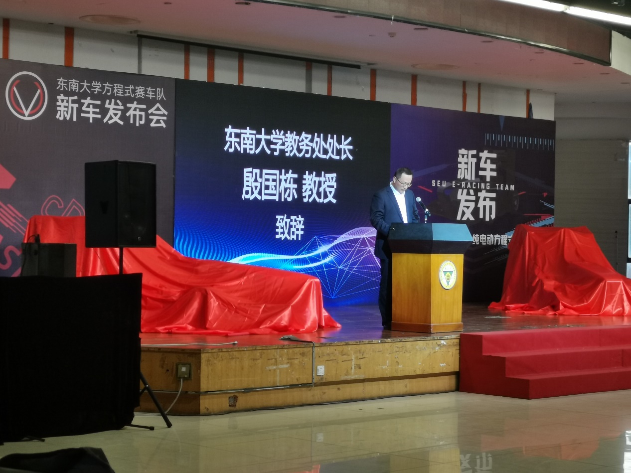 东南大学教务处处长殷国栋致辞。他表示,学校一直致力于给学生打造从理论教学到实践教学的实践平台,学生从设计到造出来,到参加比赛,是一个全流程培养学生的过程,这次新车发布会,从油车到电车,希望给学生创造一个亲手实践汽车工程科技的实验平台。