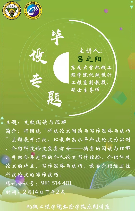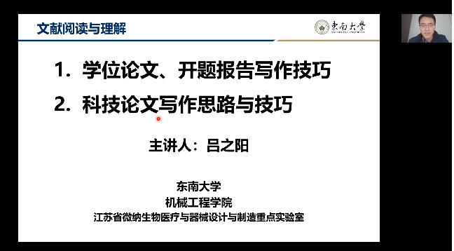 2月14日下午,毕业设计专题首场线上首场讲座开讲,由机械工程学院副教授、硕士生导师吕之阳老师围绕“科技论文阅读与写作思路与技巧”主题展开讲解。吕老师以最新高水平科技论文为实例,介绍科技论文重要部分——摘要的阅读理解,并结合吕老师的个人协作经验,介绍科技论文的特点、写作思路与技巧,并对综述性科技论文的写作技巧进行了详细阐述。在讲座的最后,吕老师针对同学们的问题发表了自己独特的见解,同学们收获颇丰。