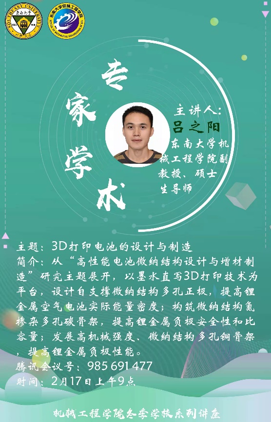 2月17日,九州线上平台副教授吕之阳老师为同学们开展了一场关于3D打印技术的讲座。围绕着3D打印电池的设计与制造这一话题,吕之阳副教授通俗详尽地介绍了增材制造的技术定义,技术特点以及应用领域,并从未来可穿戴设备的发展及智能设备小型化的趋势,对体积更小、容量更大的电池的需求,结合3D打印电池的优越特点,高瞻远瞩地提出了3D打印在电池制造方面研究的必要性。最后,吕之阳副教授展示了自己在电池微纳结构的设计与3D打印构筑的具体成果,并对3D打印电池这一领域做出了积极的展望。
