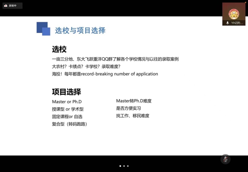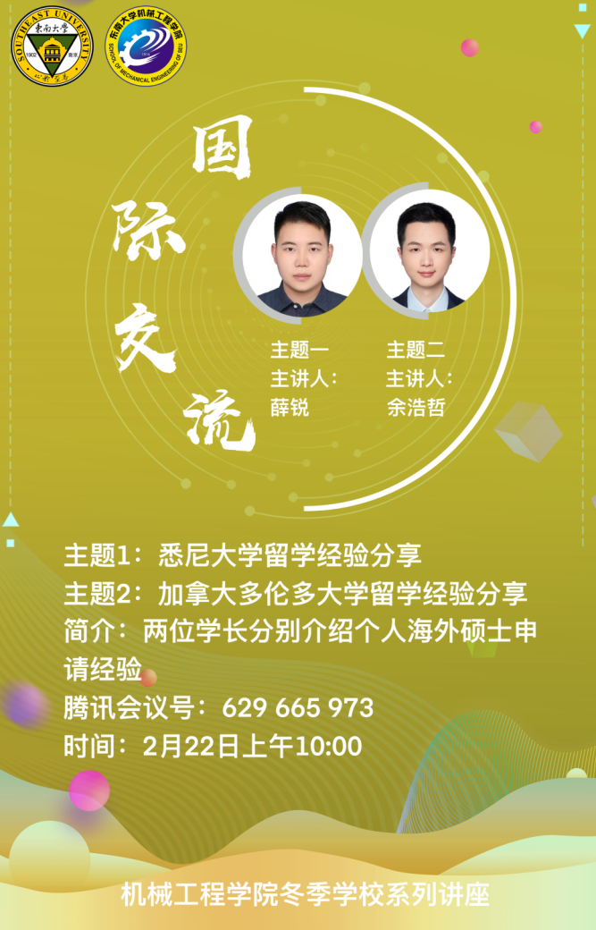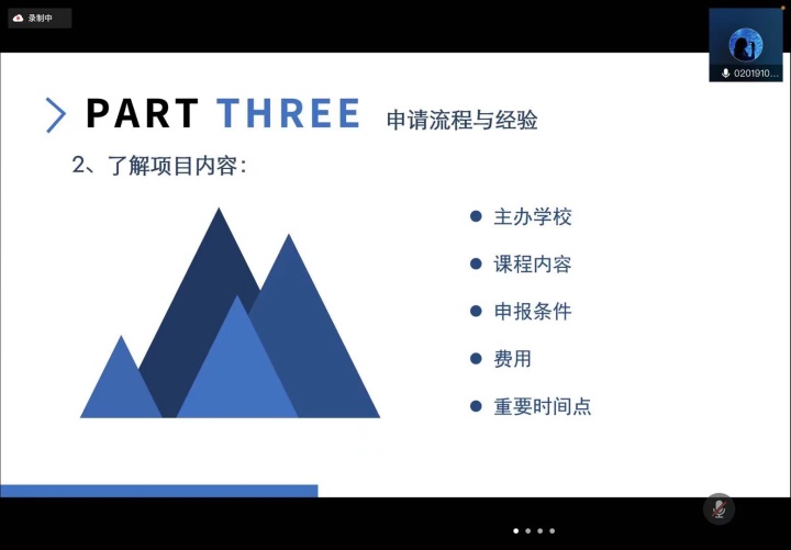 2月16日上午,国际交流讲座系列的首场讲座在线上开展,国际交流合作处的赵益姝老师以及2018级本科生赵浩博学长分别对东南大学国际交流整体政策、早稻田大学3+2项目进行了分享。赵老师主要对目前申报较多的交流项目进行了分析讲解,并概括了校内手续办理的一般步骤,对校内各部门的分工进行了简要介绍。最后,赵老师也对参加国际交流的目的进行了进一步概括,也希望同学们可以结合自身情况,选取最适合自己的项目。赵浩博学长则以早稻田大学的基本情况以及地理环境开题,讲述了所申报项目的学院构成及整个学期的具体时间安排和课程安排。最后,赵浩博学长对申报该项目的要求和所需的资料进行了概括,并对申报该项目的优势进行了分析总结,也希望感兴趣的同学可以积极参与。