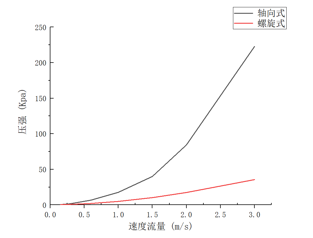 两种水道对比我们可以发现在同种流速下,轴向式水道的进出口压力平均值要高于螺旋式水道,并且螺旋式水道随着入口流速增加而增加的趋势比较缓;