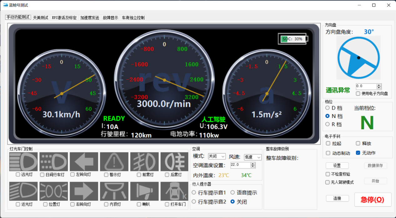 主要完成了急停控制、车身控制、纵向控制、横向控制以及其他相关测试,得到了蓝鲸号功能总结报告与性能测试报告,共测试了150项,其中未通过有21项,通过率为86%