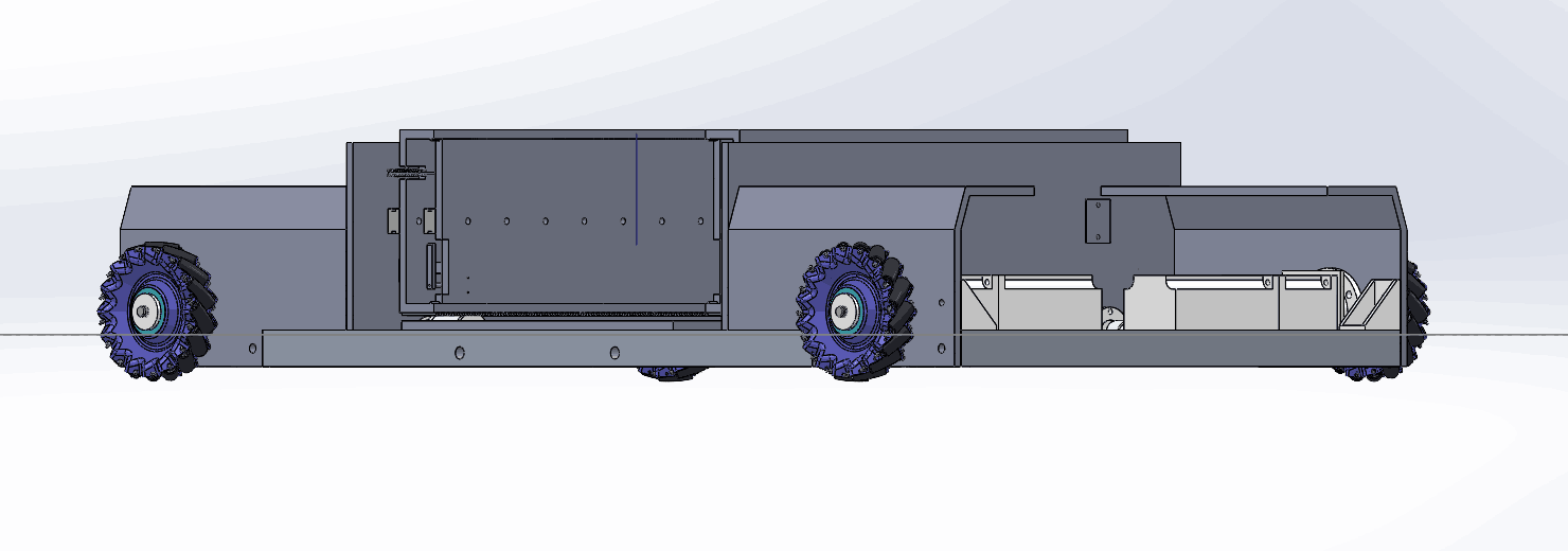 本项目对行走功能元采用麦克纳姆轮作为执行元件,可实现小车的四向行走;货物拣取功能元选用同步带、滑轮钢绳机构组合形成三级伸缩货叉配合叉板顶端拉钩实现。项目完成整车模型建立、关键参数计算校核以及关键零件图纸绘制。