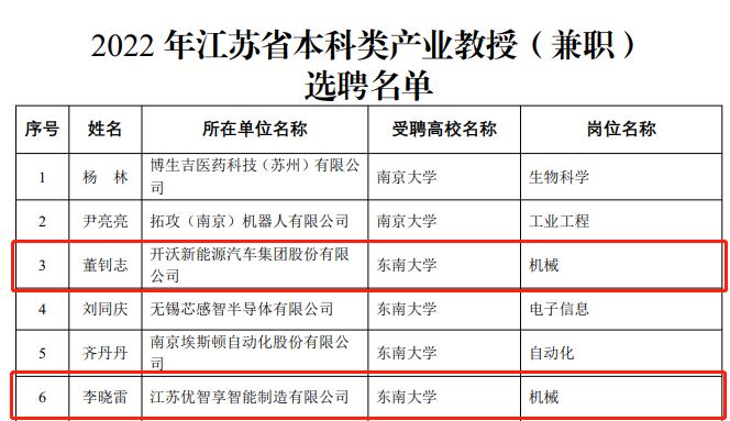 近日,江苏省教育厅公布了2022年江苏省本科类产业教授(兼职)选聘名单,我院推荐的开沃新能源汽车集团股份有限公司董钊志和江苏优智享智能制造有限公司李晓雷2名科技企业家获批为江苏省产业教授。