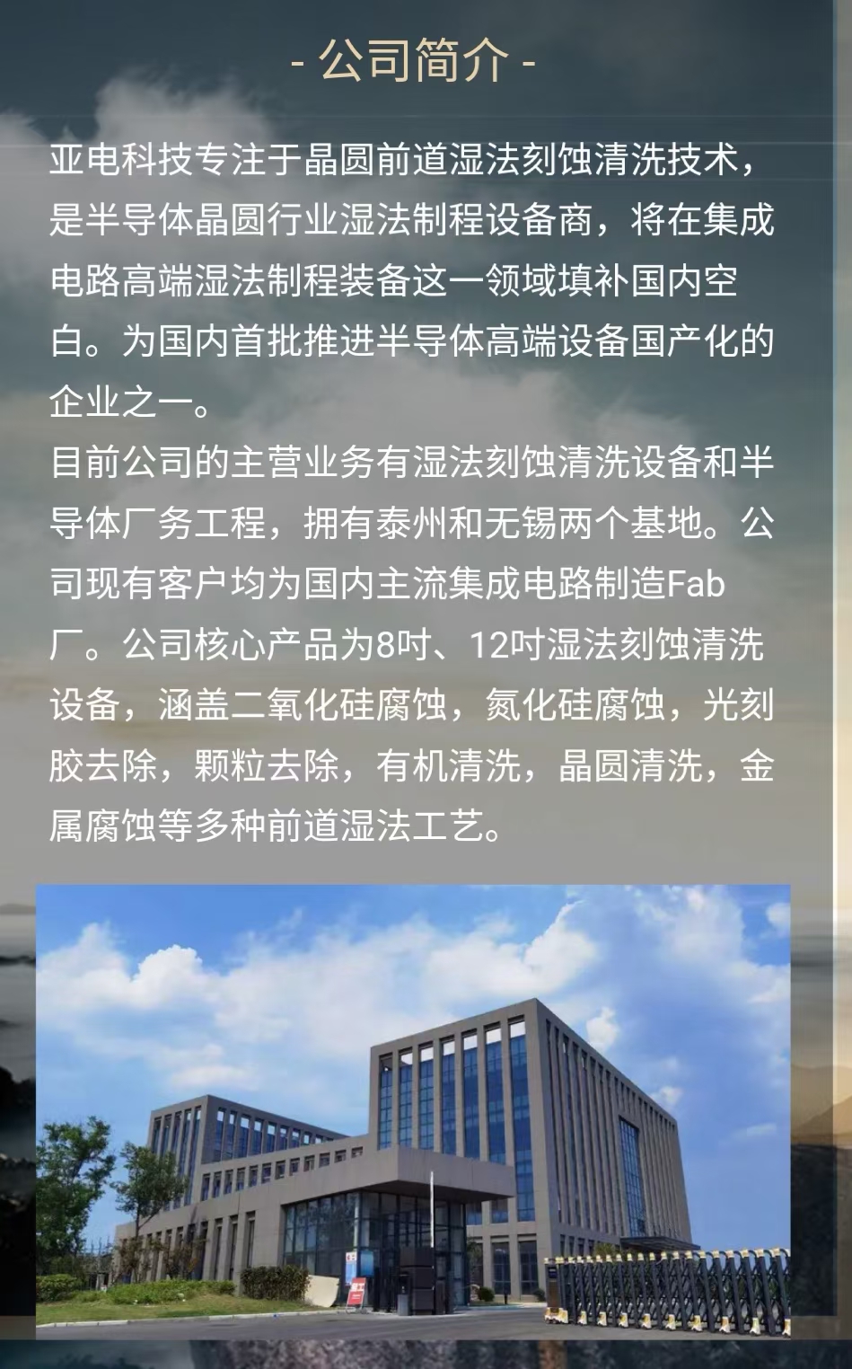 江苏亚电科技是半导体晶圆制造行业湿法制程设备商,专注于晶圆前道湿法刻蚀清洗技术,是国内首批推进半导体高端设备国产化的企业之一。核心产品包括8吋、12吋槽式湿法刻蚀清洗设备,作为一家拥有自主知识产权的高新技术企业,所有核心技术均已申请发明专利。通过多年的技术研发和积累,亚电通过多样化、个性化的解决方案致力于为客户提供更有竞争力的产品和服务。