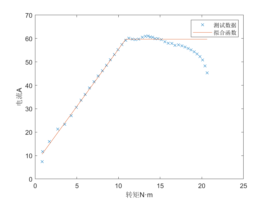 3.整理数据,记录空载点、最大扭矩点、最大输出功率点以及最高效率点处的各项参数数值,绘制扭矩-电流、扭矩-转速以及扭矩-效率等图像,将各组数据拟合为多项式函数,并结合电机铭牌参数与理论函数进行数据分析。
